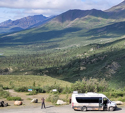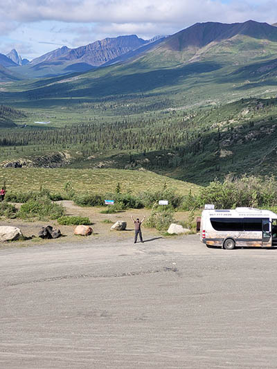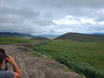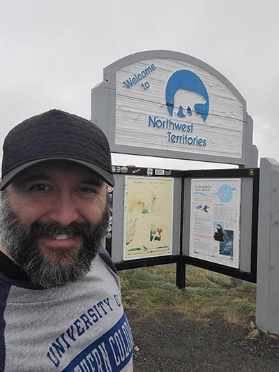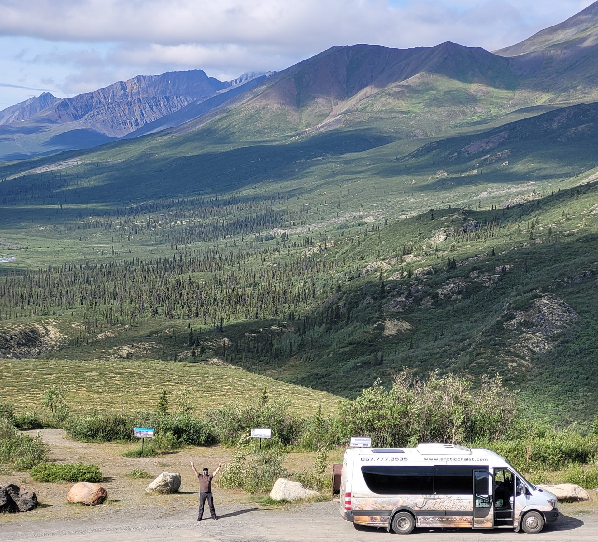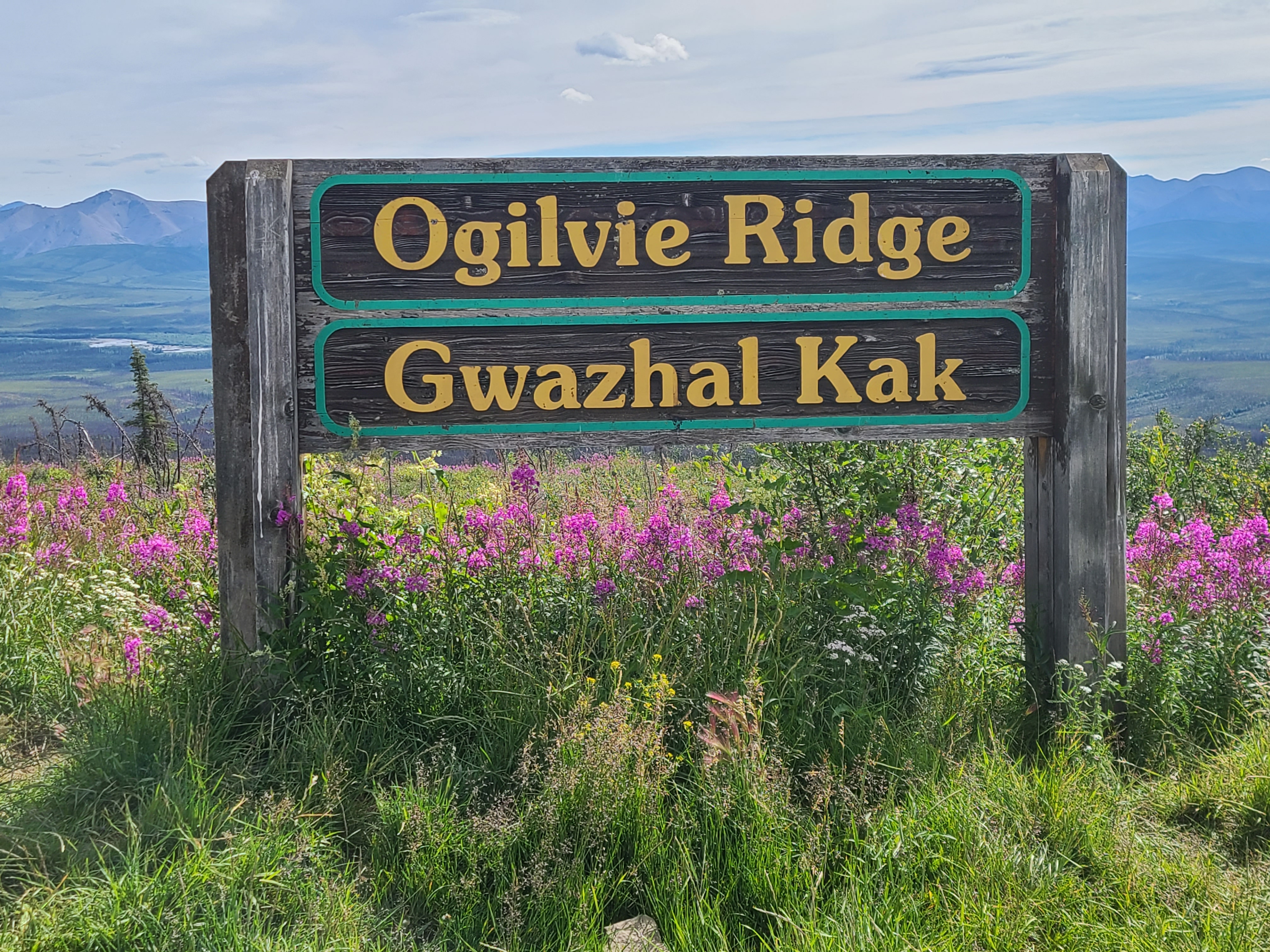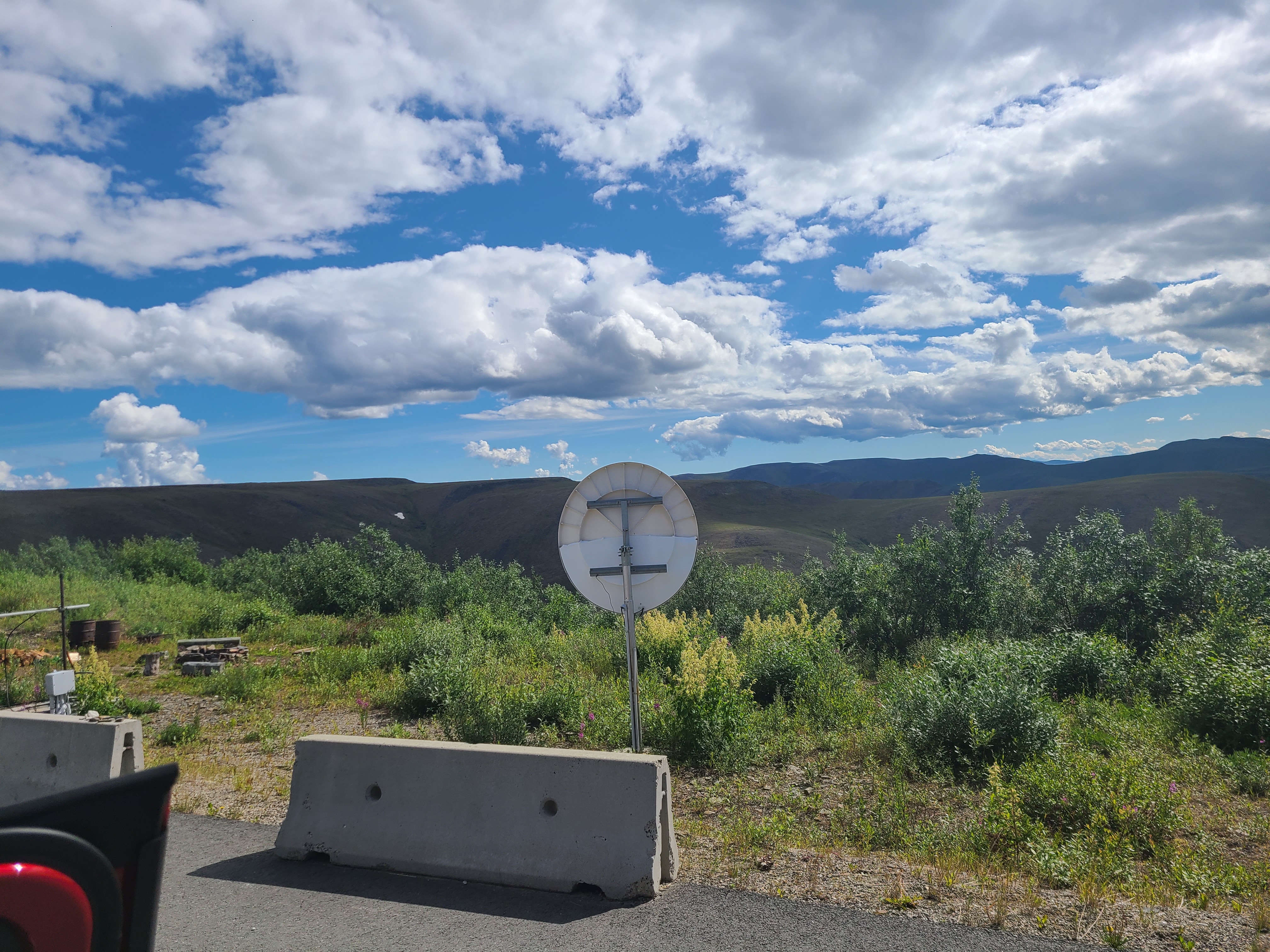 Where the Dempster crests a ridge of the Richardson Mountains, it's the border of the Yukon and Northwest Territories. It has a constant 50 mile per hour wind.
