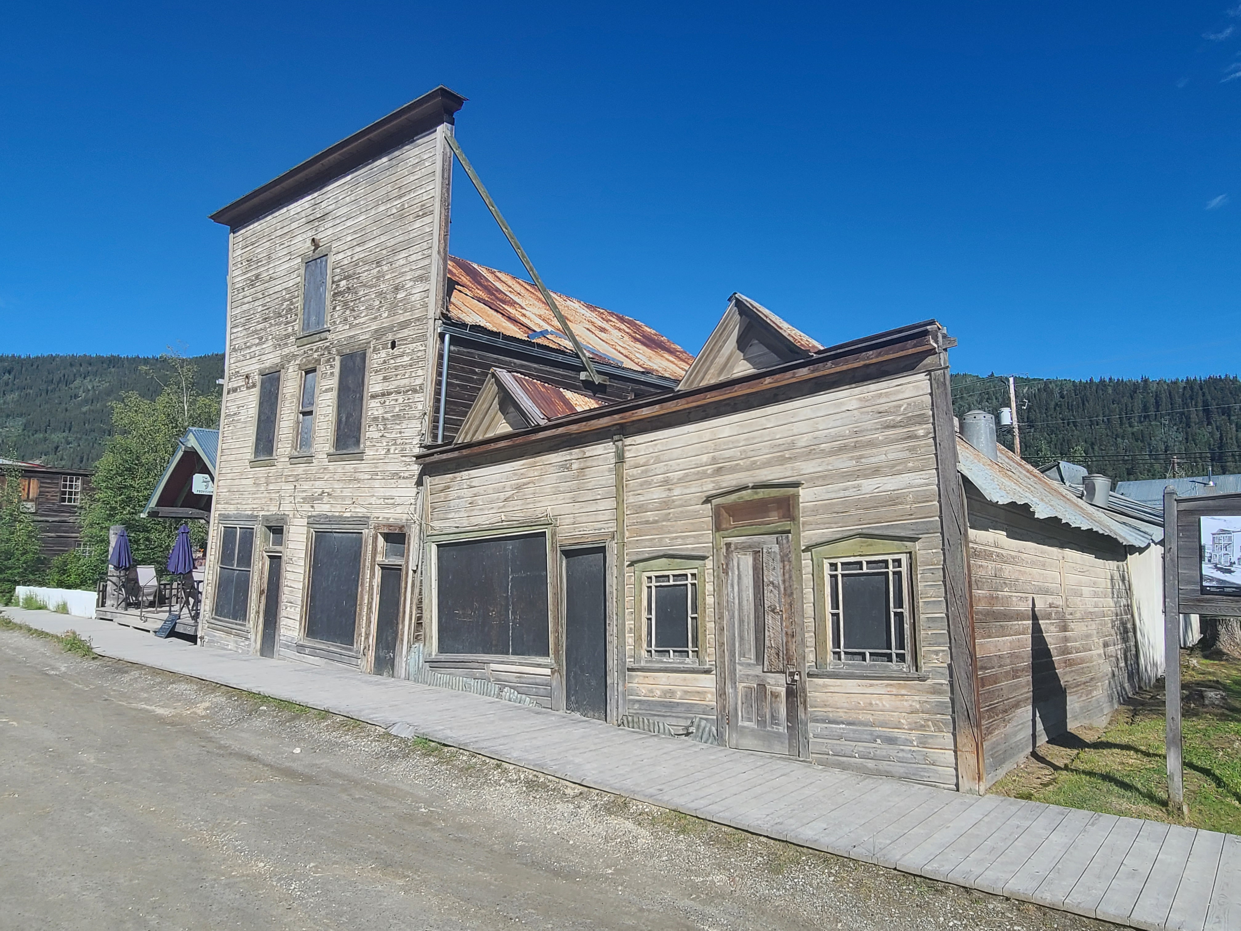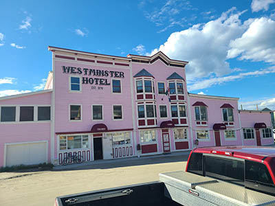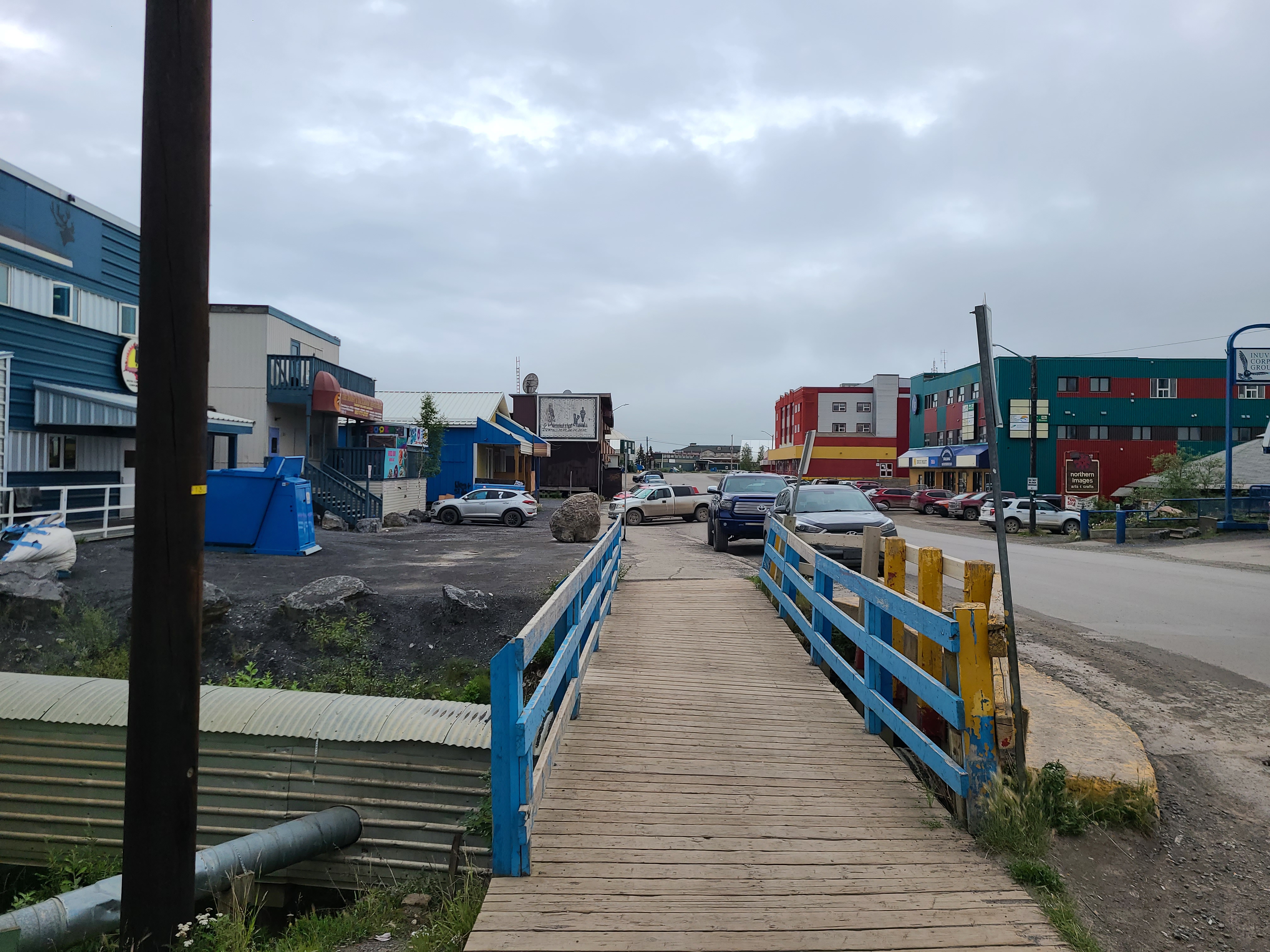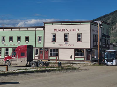Here's the main stretch! To the left - the Mad Trapper (with the satellite dish). To the right - shops, administration and the Mackenzie Hotel in the distance.