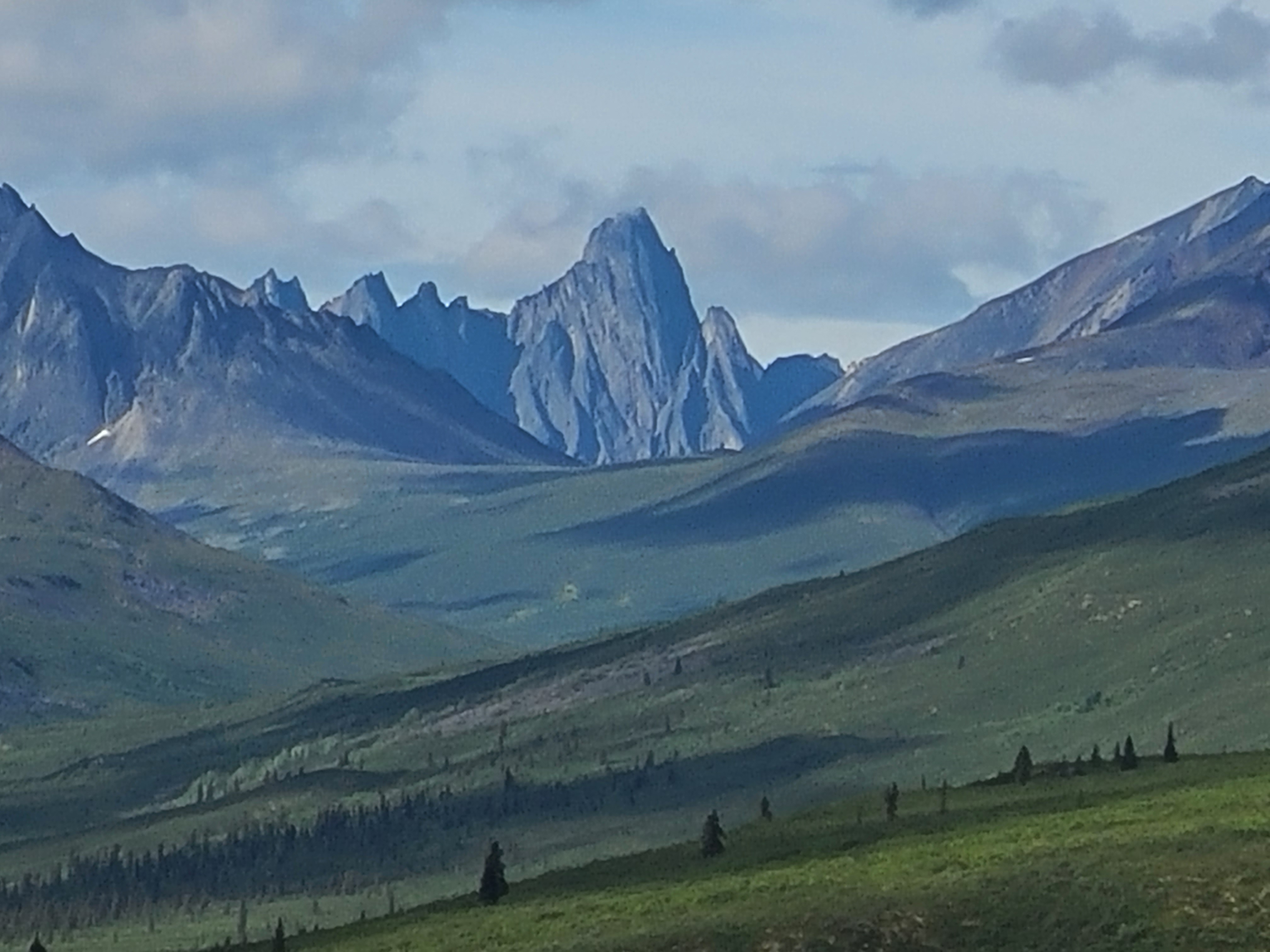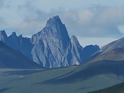 The mighty Tombstone Mountain, 11 miles away from the road. Most majestic of the Ogilvie Mountains.