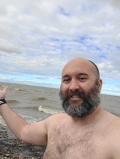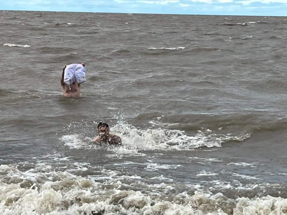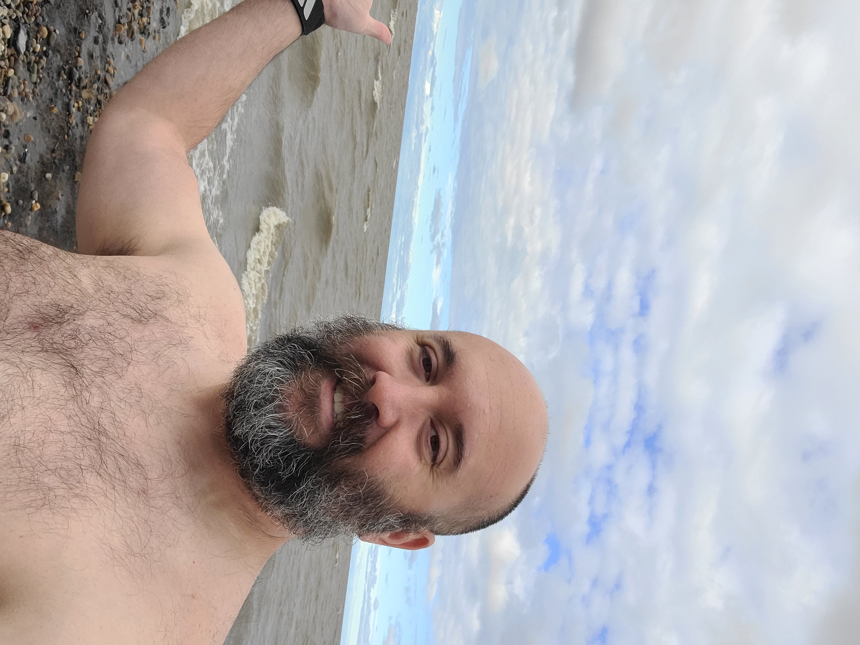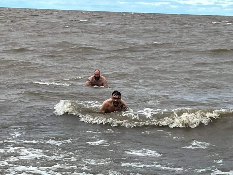 Can you tell it was cold? We're hulking out because we're both racing to get our swimming trunks back on. There was a tiny rip as well so if we didn't have our feet planted we were moving away from shore.