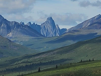A wider view of some of the mountains within Tombstone Provincial Park.